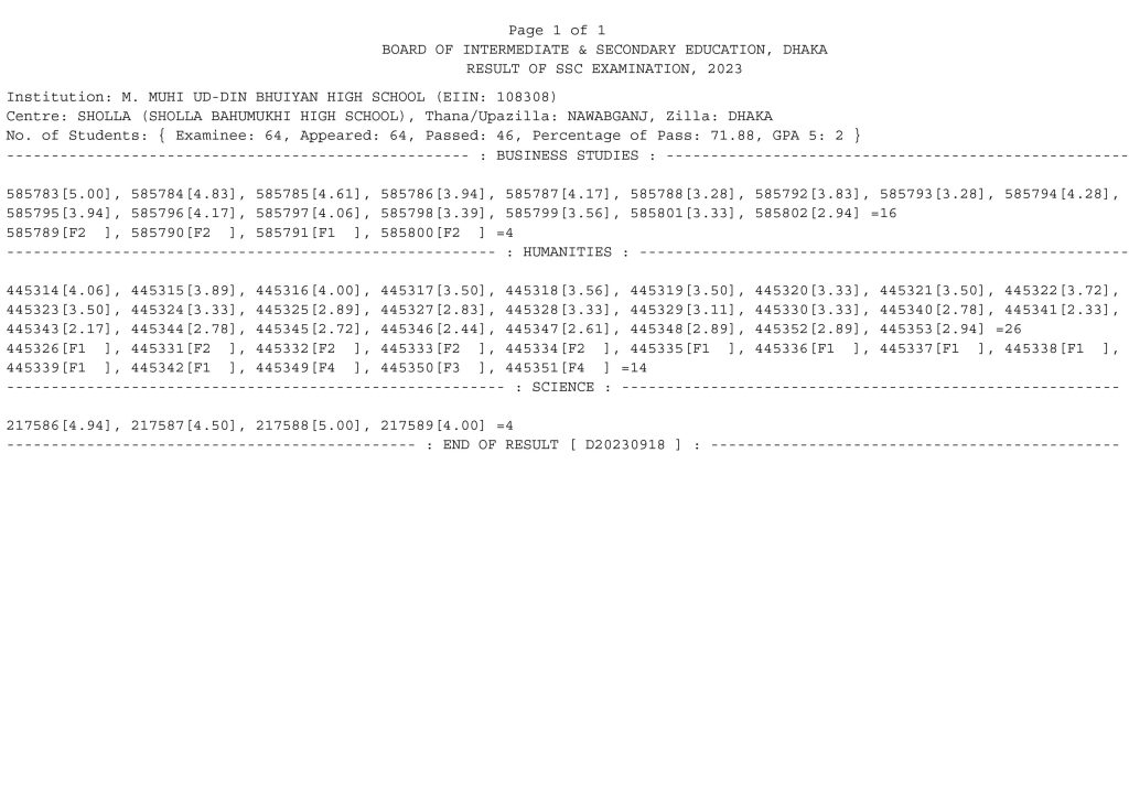 এস এস সি পরীক্ষার ফলাফল ২০২৩ খ্রিঃ